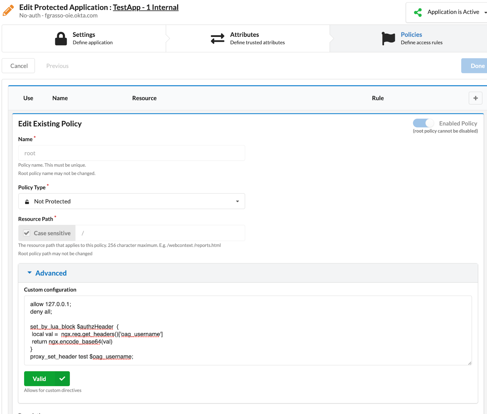 OAG - Okta Access Gateway, doesn’t provide an out of the box way to encode in Base64 the header to be sent to an internal application. However, it is quite common for legacy applications to require Base64-encoded data (e.g., the username of the authenticated user). This guide takes advantage of the ability to edit the OAG nginx configuration to create a simple function that allows you to manage Base64 encoding.